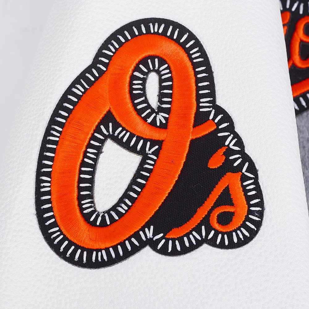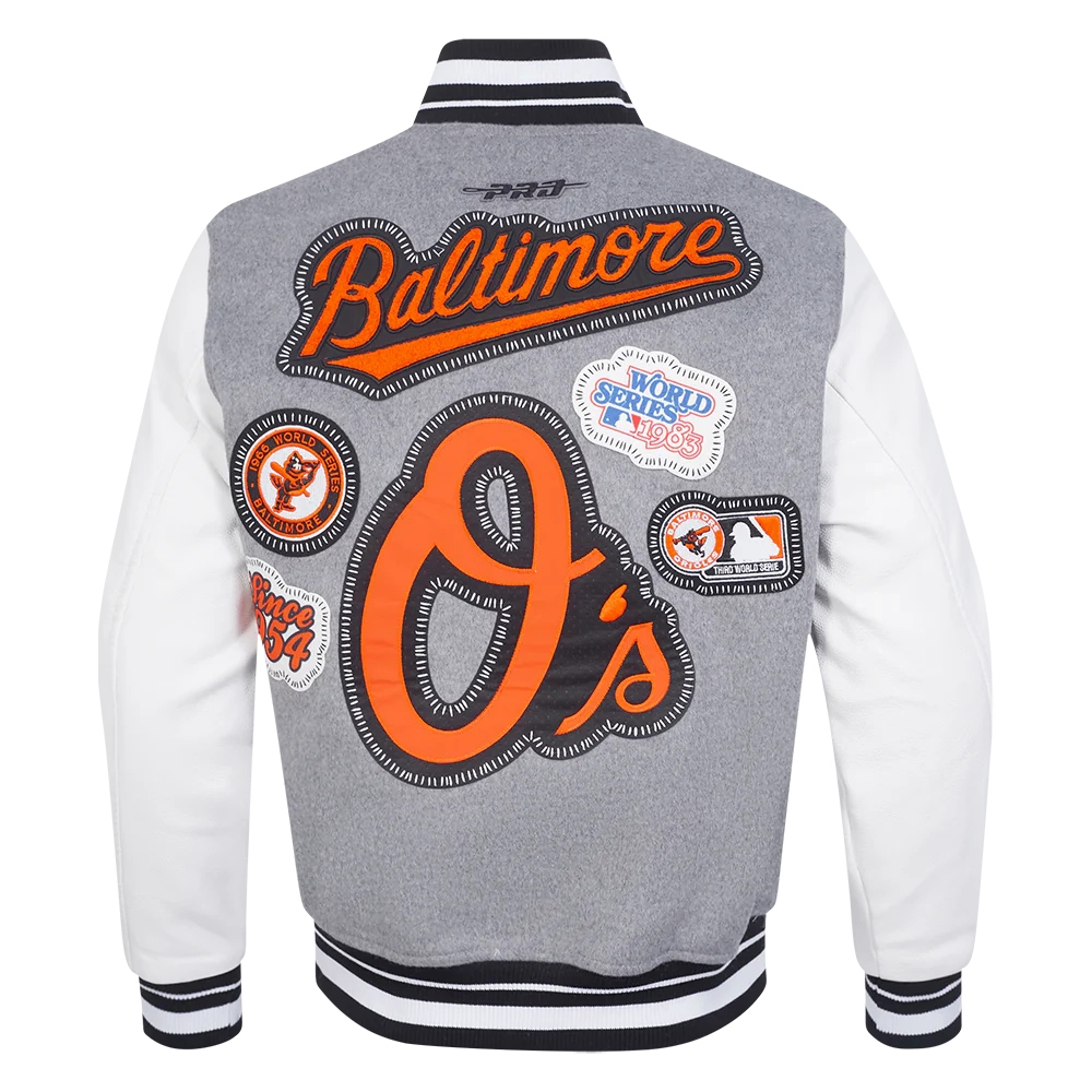Introducing the Baltimore Orioles Diy Pick Stitch jacket, a stylish and comfortable choice for men and women. Made from a durable wool and leather blend, this jacket features a striking grey and white color combination. The inner viscose lining ensures a soft feel, while the ribbed knitted collar, cuffs, and hemline provide a secure and comfortable fit. The Orioles Pick Stitch varsity jacket showcases bold embroidered patches, including the iconic “O’s” logo, “Baltimore” text, and commemorative patches such as “Since 1954” and “World Series 1983.” The front features a button and zipper closure for added security, and the full leather sleeves complete the sleek design. Two slashed waist pockets and two inner pockets offer practical storage for all your essentials. Perfect for loyal team fans.