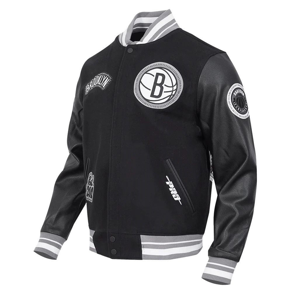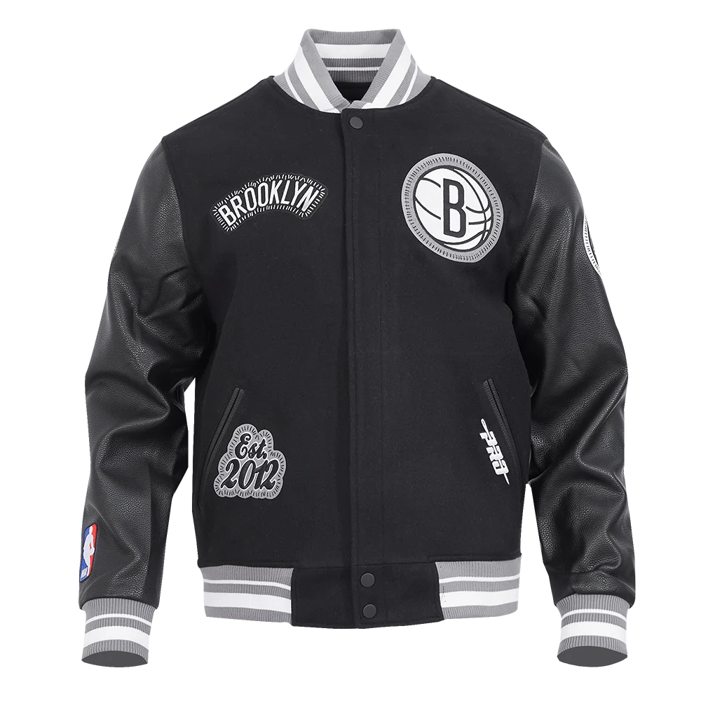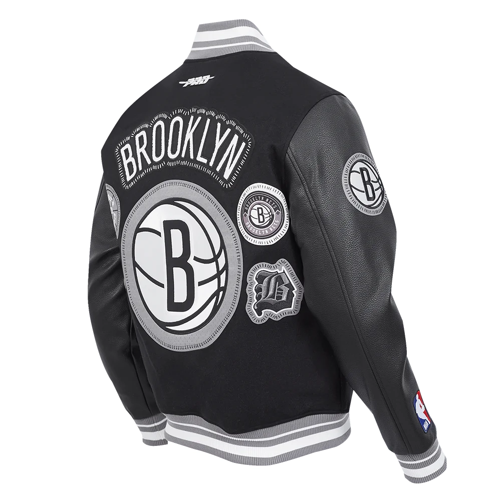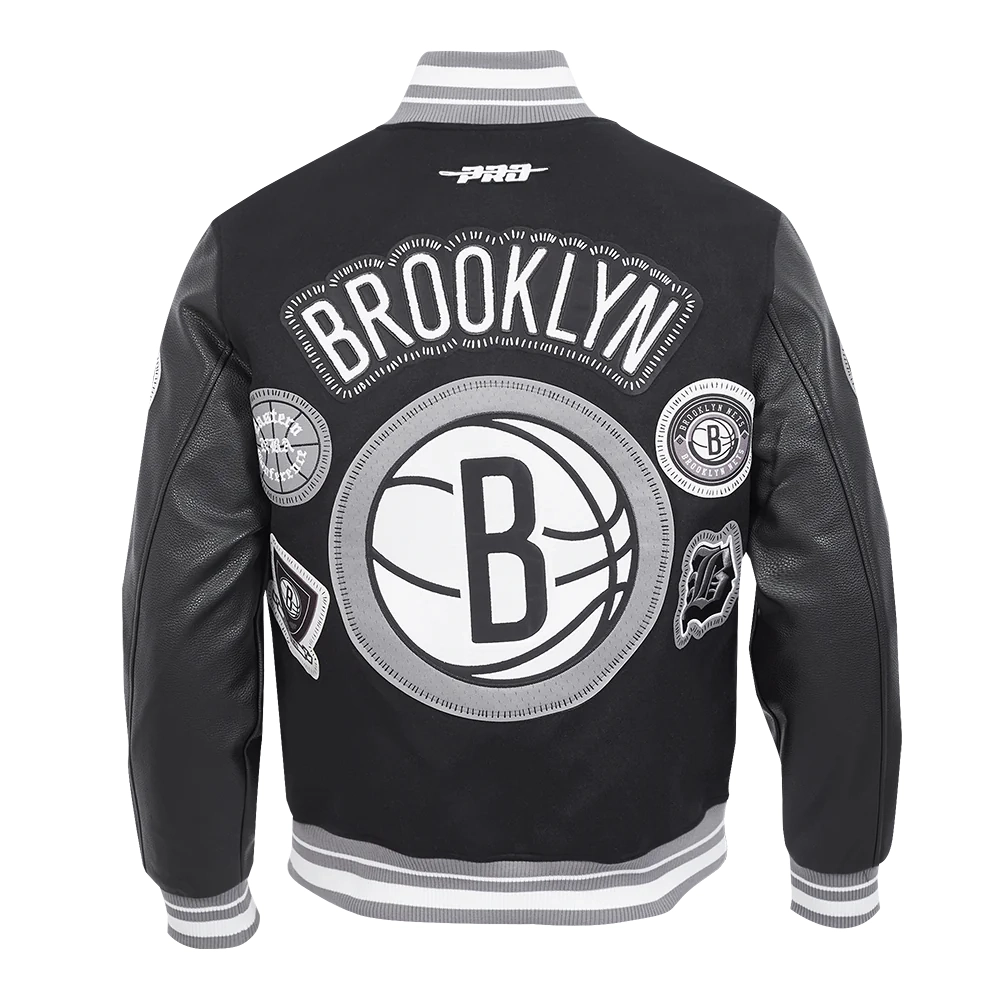 The Brooklyn Nets DIY Pick Stitch Jacket from the DIY Pick Stitch collection stands out with its bold design and premium craftsmanship. Made from a high-quality blend of wool and leather, it features embroidered team logos and patches, a signature of the collection. The front showcases the team logo, while the back features a large team emblem and smaller patches on the sleeves and body.