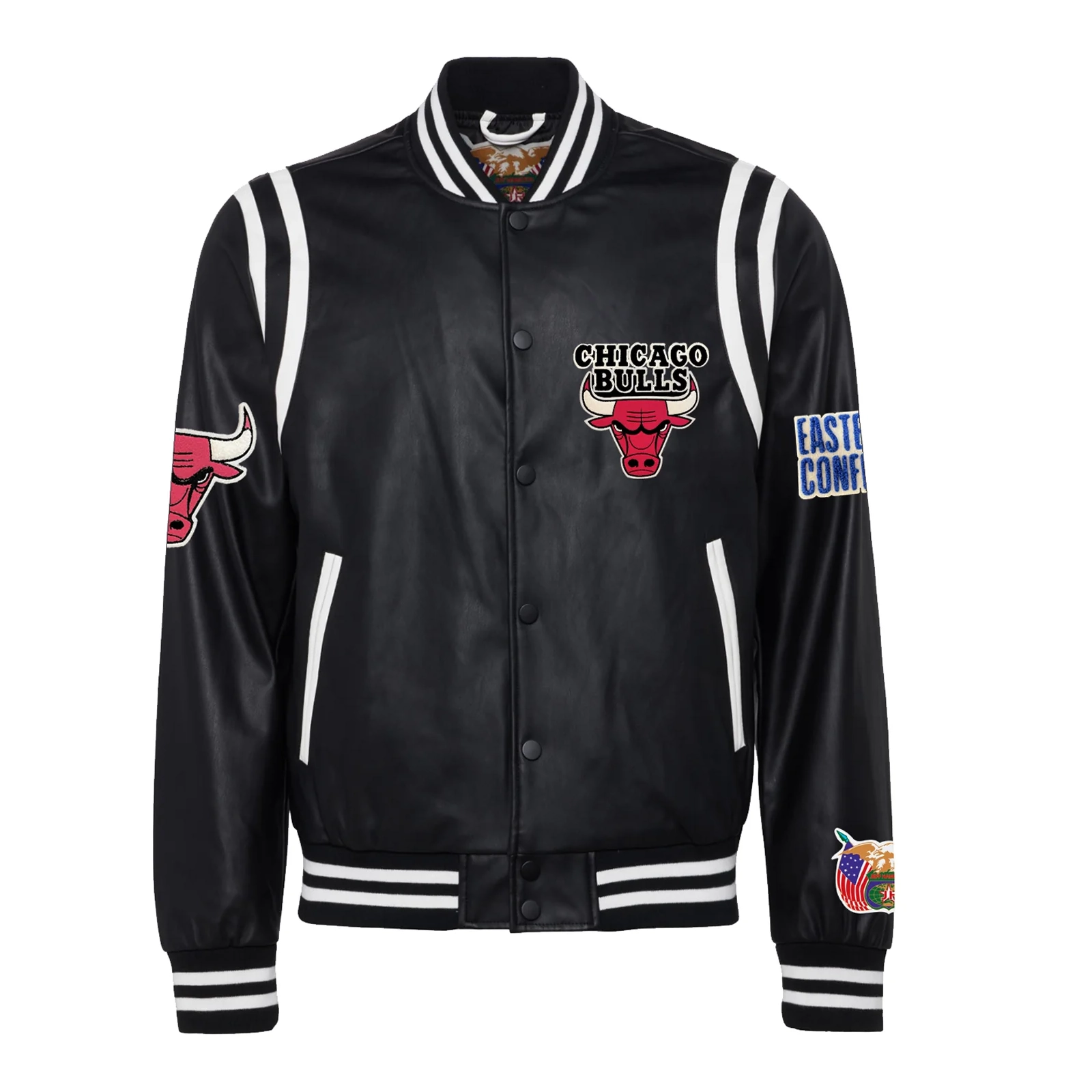 This Chicago Bulls Vegan Leather Jacket offers the perfect blend of classic varsity style and team loyalty. Crafted from high-quality vegan leather, it ensures a beautiful, smooth texture and deep black colour without compromising your style. It features a viscose lining on the inside, providing warmth on chilly evenings. The traditional varsity design is evident through the stripes on its rib knit collar, cuffs, and hem, which provide a comfortable and attractive fit. The front full snap closure makes it easy to put on and offers a clean look. For practical use, the jacket features two exterior pockets with white stripes and additional interior pockets. Showing your loyalty with confidence, the Chicago Bulls’ iconic primary logo is prominently displayed on the back of the jacket, and a smaller version of it is patched on the chest. Additional Eastern and Western Conference patches on both sleeves finish this statement piece. This Bulls vegan Leather Full Snap Jacket is perfect gear for every true fan.