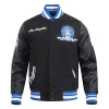The LA Dodgers Team Badge Wool & Leather Jacket is the perfect choice for both men and women who want to represent their team in style. Crafted from a durable wool blend and genuine leather, this sleek black jacket features a ribbed knitted stand-up collar, cuffs, and hemline with blue and white accents, offering a secure and comfortable fit. The flat shank button and metal zipper closure add both practicality and style. Inside, the soft viscose lining ensures comfort throughout the day. Embroidered with the team name and logo on the chest, back, and sleeves, this Dodgers Team Badge varsity jacket proudly displays your Dodgers pride. With two slashed waist pockets and two inner pockets, provides both functionality and flair. A must-have for any fan.