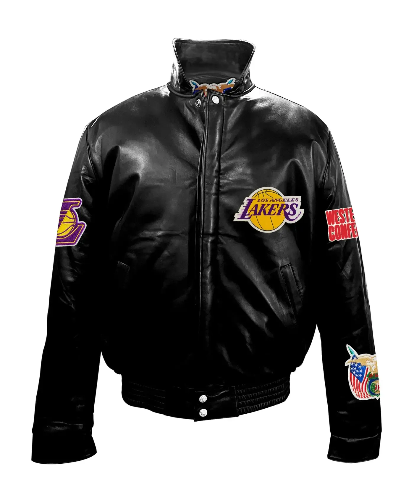 This Los Angeles Lakers black puffer jacket is a bold and classy choice. It instantly upgrades every fan’s wardrobe. The shiny black leather material makes it a must-have. The front zipper closes smoothly, and snap buttons on the collar and waistband secure it perfectly. On the left chest, the embroidered Lakers logo gives the outerwear an authentic look. The right sleeve features an ‘L’ patch in the team’s colors, which creates a sporty vibe. The left sleeve carries a red and white Western Conference patch. Near the cuff, an intricate design shows the globe, the American flag, and an NBA theme. The back of the Lakers’ black bomber jacket highlights a large embroidered Lakers logo at the center. This bold design makes it stand out. The cuffs on the sleeves have snapped buttons, which provide an adjustable fit and extra comfort.
