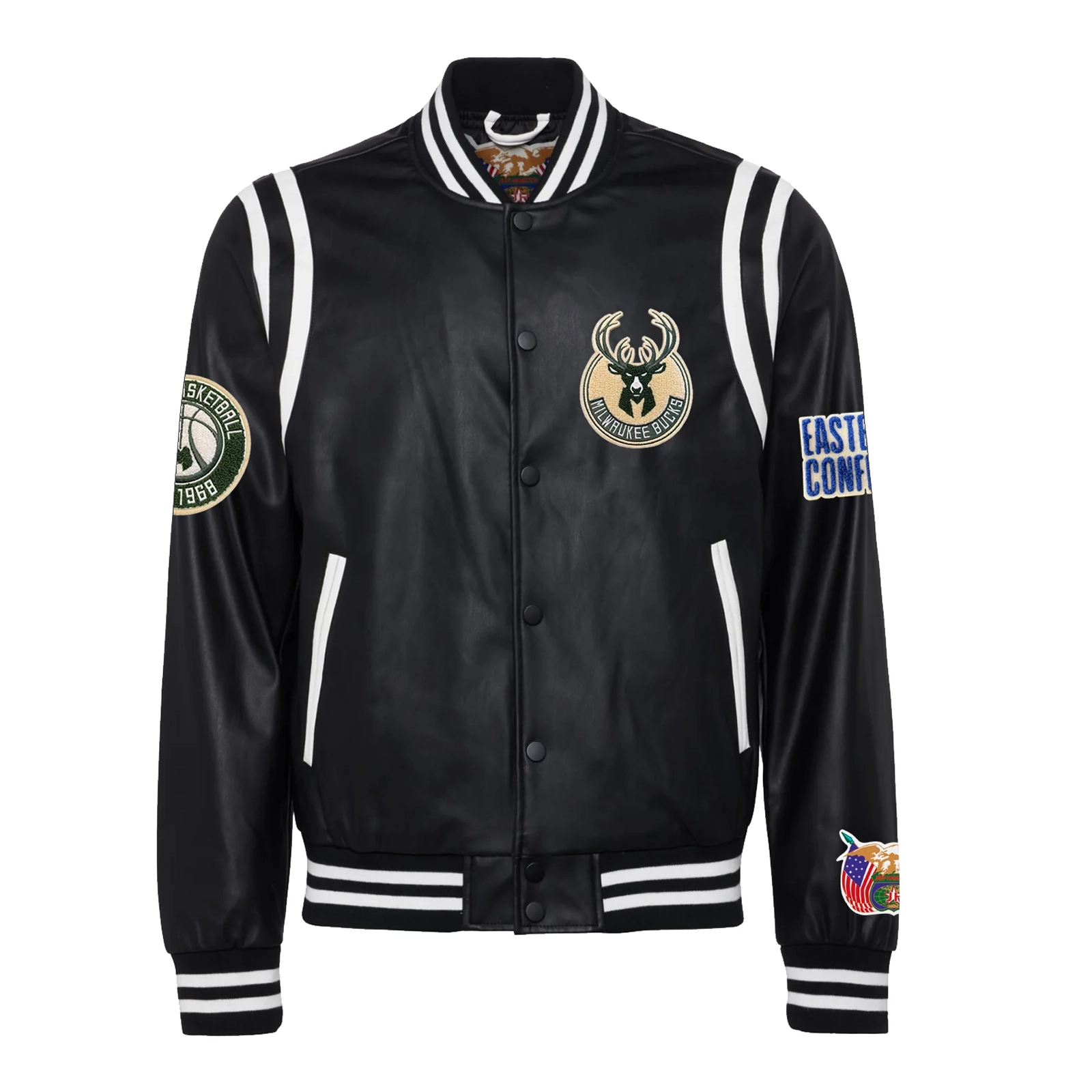 Milwaukee Bucks Vegan Full-Snap Black Leather Varsity Jacket