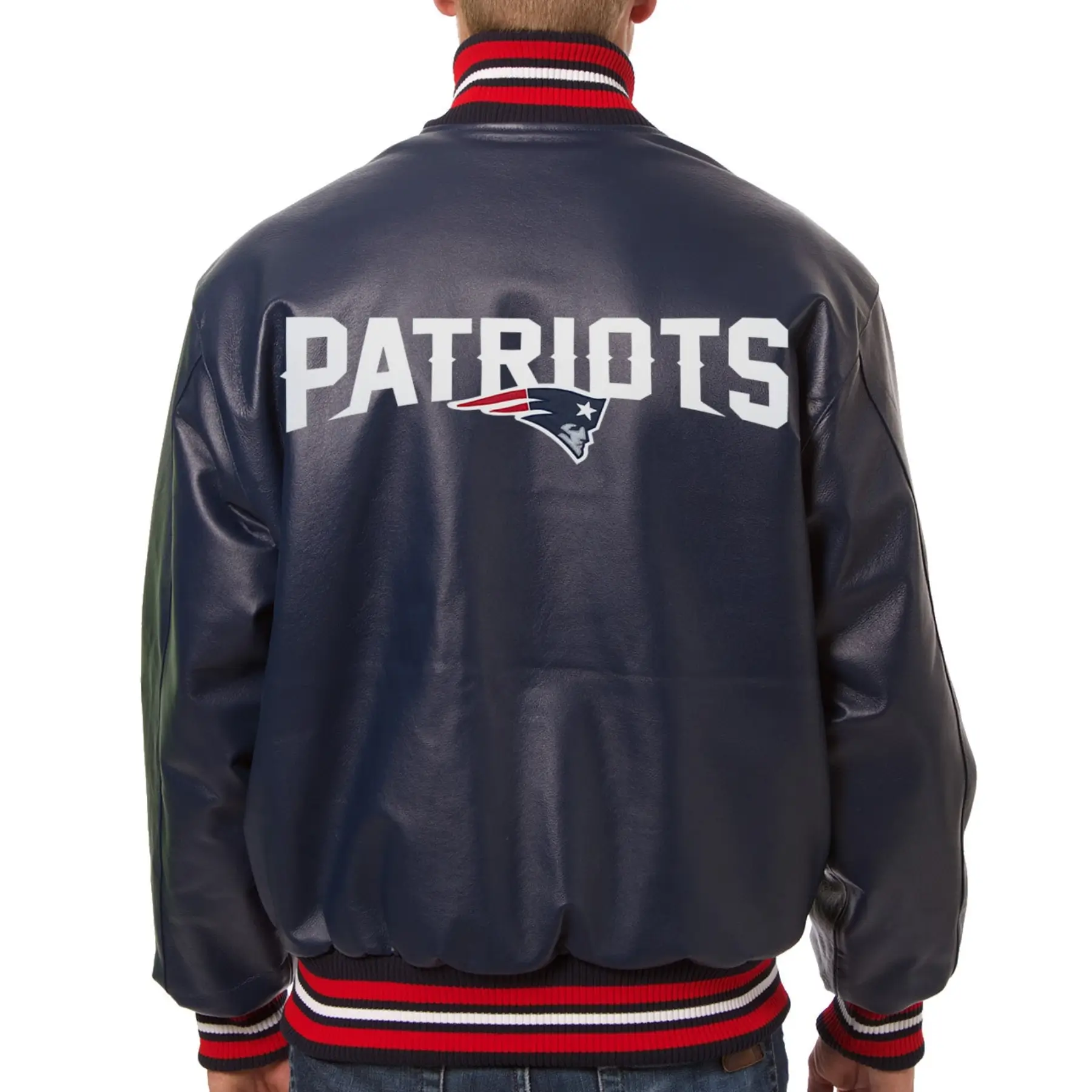 This Patriots Navy Leather jacket is unisex and can be worn with black jeans or high tops for a sporty but casual style. Inside the outerwear viscose lining offers a smooth touch. It has two spacious, practical pockets outside the jacket for easy access to your essentials and an extra pocket inside to keep your items secure. Whether you wear it in the stadium or for everyday use, this Patriots Navy Blue varsity jacket catches the true spirit of the Patriots. It keeps you comfortable with your enthusiasm and fashion sense.