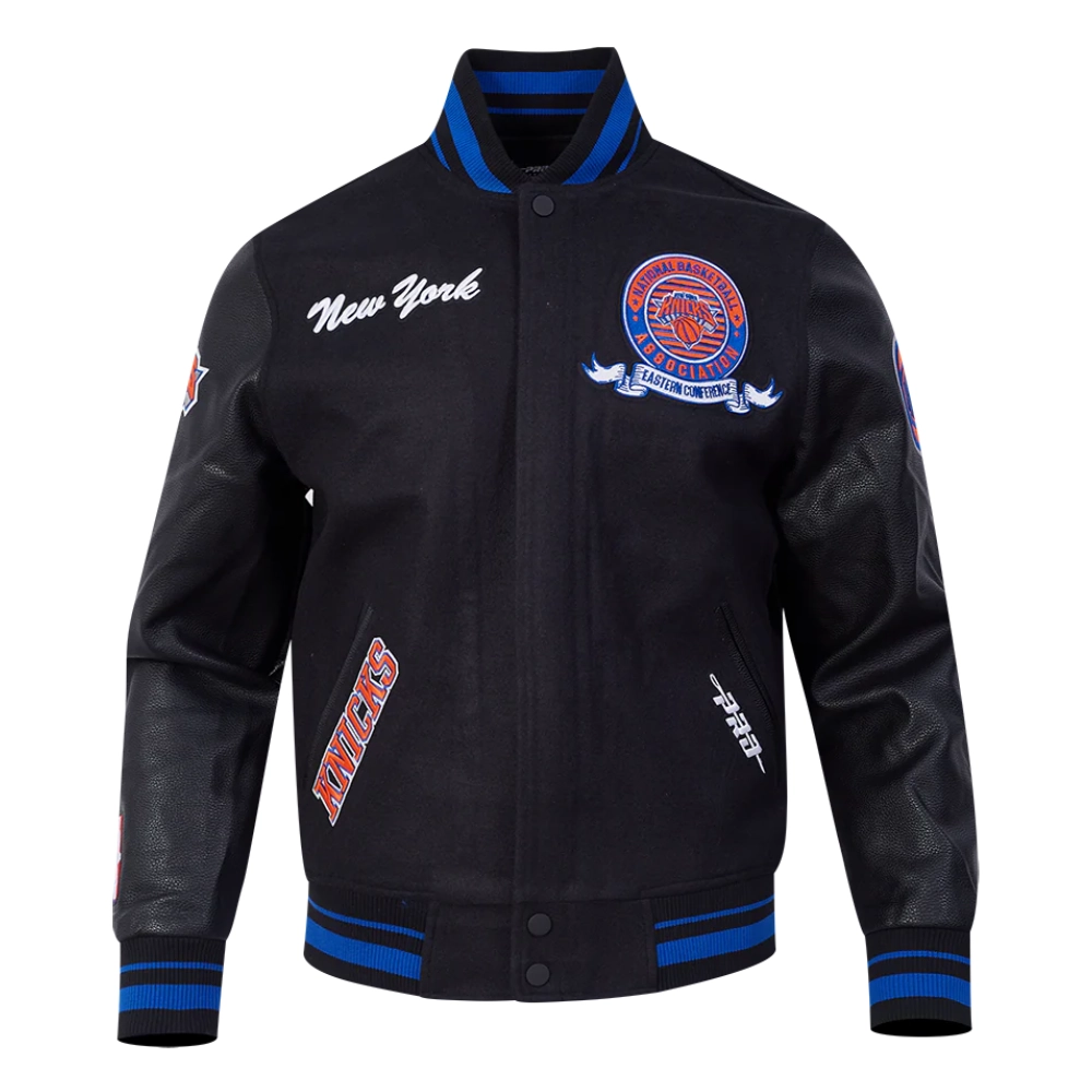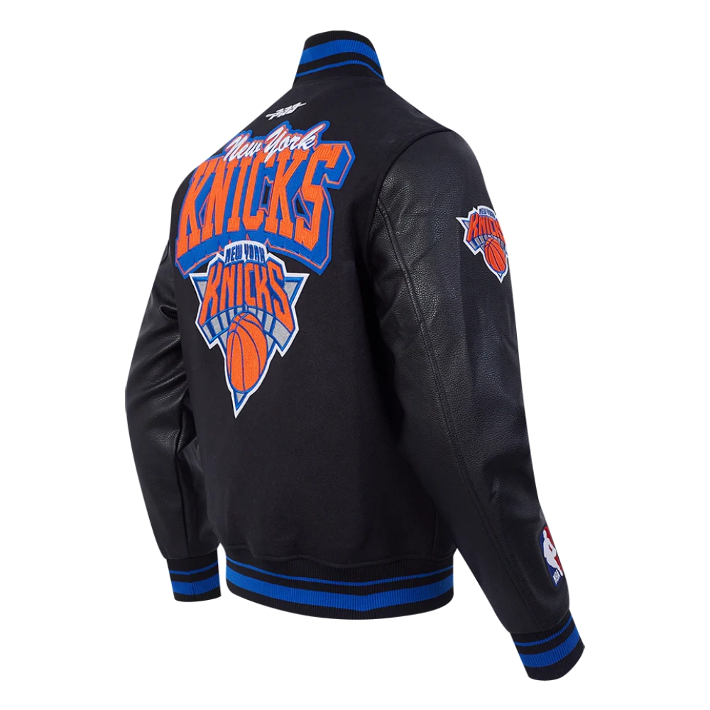 The New York Knicks Team Badge Varsity Jacket is the perfect blend of style and comfort for both men and women. Featuring a sleek black color, it combines high-quality wool and leather for a durable, fashionable look. The ribbed knitted collar, cuffs, and hem, with a touch of blue, add a classic sporty appeal, while the full leather sleeves enhance its premium appeal. The front closure includes both a button and a zipper for a secure, adjustable fit. Inside, a soft viscose lining ensures comfort throughout the day. The NY Knicks Team Badge varsity jacket is decorated with embroidered team name and logo applique patches on the chest, sleeve, and back, proudly showcasing your New York Knicks spirit. For added practicality, it includes two slashed waist pockets and two inner pockets. Whether you’re at the game or out on the town, this jacket is a stylish way to support your team.