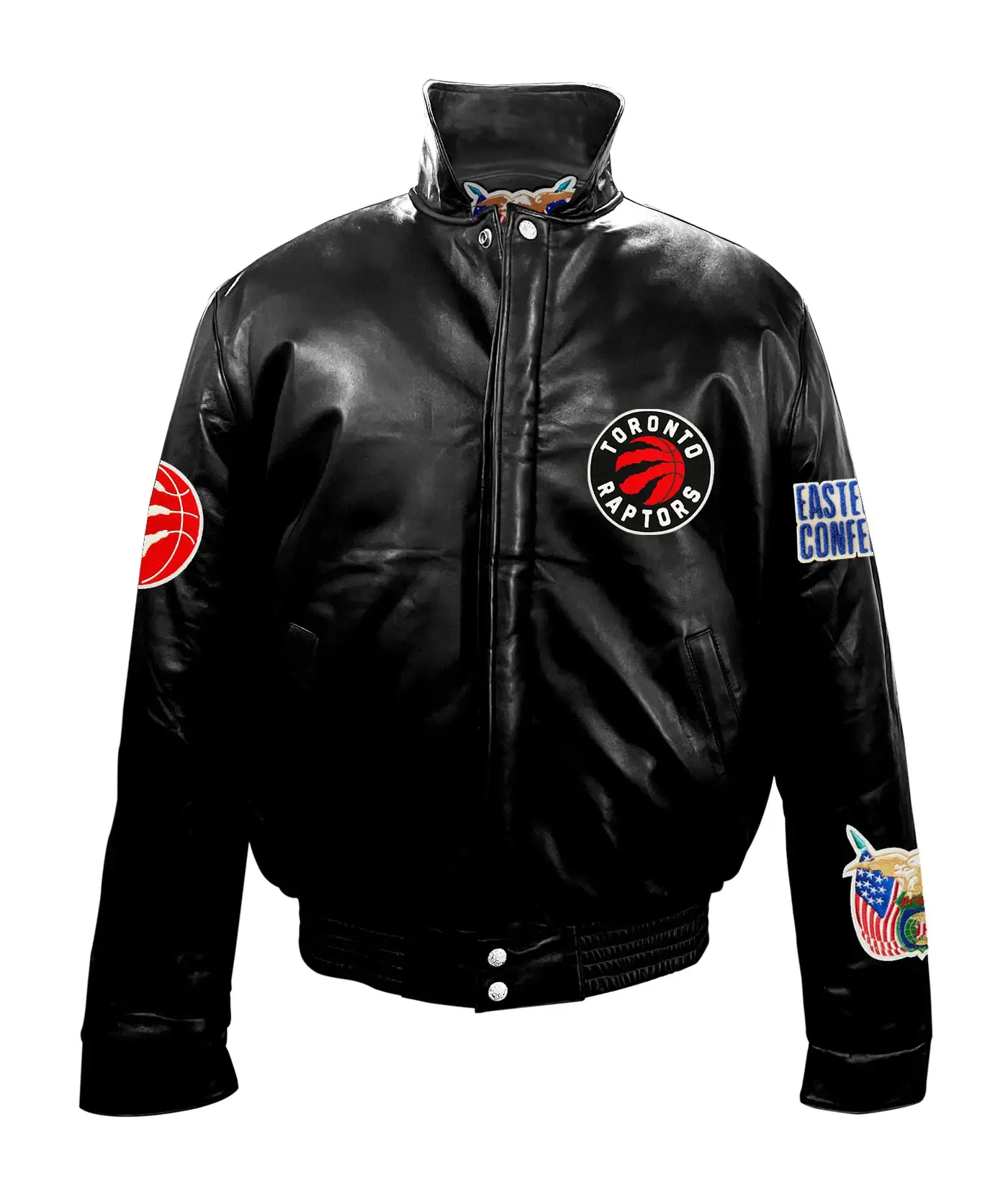 A big and heartwarming circular official team logo patch can be seen on the back of the jacket. A classy “Eastern Conference” patch on the upper right sleeve adds an awesome flair, while the small but beautiful Raptors logo patch on the upper left sleeve adds to the uniqueness. There is an interesting eagle and American flag design patch on the lower left sleeve, which symbolizes patriotism. All these patches together make the Raptors black leather jacket vibrant and exciting. With this outerwear, you not only set a fashion statement but can also adopt a team spirit that is close to the heart of every fan.