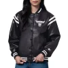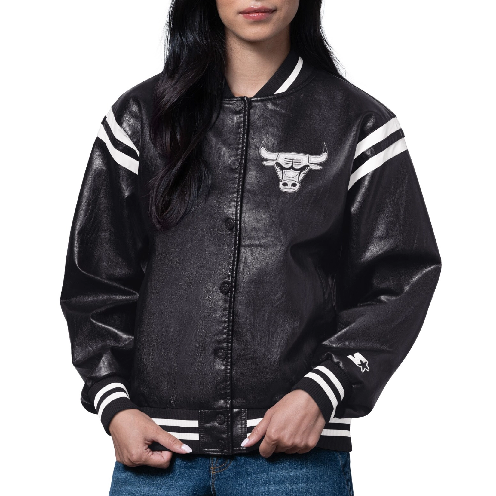 Introducing the Women’s Chicago Bulls High Heat Jacket, a standout piece for any fan. Made from premium black leather, it features ribbed knitted details on the collar, cuffs, and hemline for a comfortable and secure fit. The bold white stripes on the shoulders give it a sporty edge. Full sleeves offer additional warmth, while the button closure ensures ease of use. The interior is lined with soft viscose for comfort, making it perfect for any occasion. Embroidered team name and logo appliques on the chest and back proudly display your support for the team. With two slashed waist pockets and two inner pockets, this Bulls High Heat leather jacket combines style with practicality, offering both function and flair for every fan.