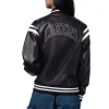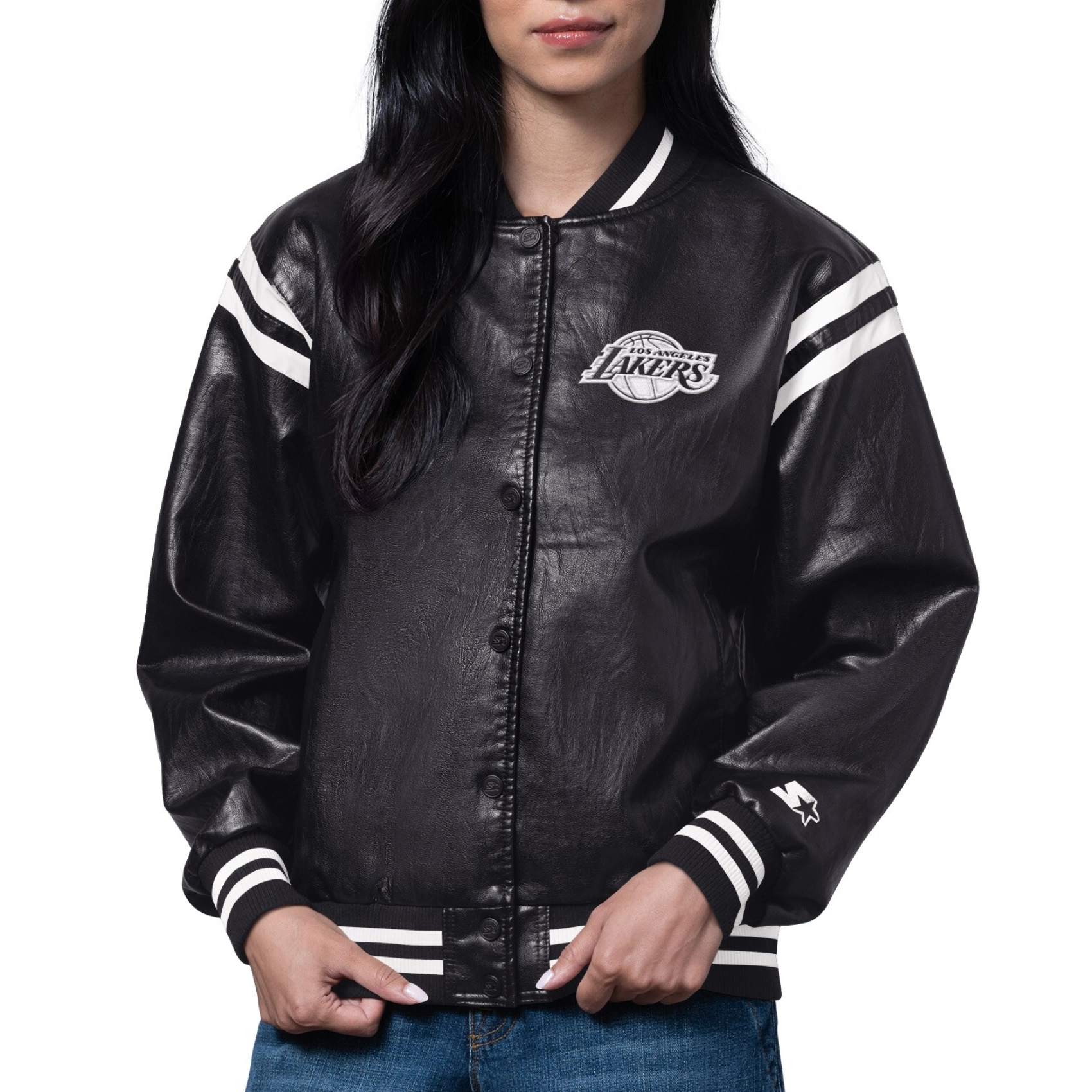 Introducing the Women’s Los Angeles Lakers High Heat Jacket, a stylish and functional piece that combines team pride with sleek design. Made from durable black leather, this jacket features a ribbed knitted collar, cuffs, and hemline for a snug, comfortable fit. The bold white stripes on the shoulders add a sporty touch, giving it a dynamic, athletic look. Full sleeves provide warmth, and the snap button closure at the front ensures easy wear. Inside, the LA Lakers High Heat Leather jacket is lined with viscose, offering a soft and comfortable feel. Embroidered team name and logo appliques on the chest and back proudly display your NBA team loyalty. With two slashed waist pockets and two inner pockets, this piece combines both style and practicality, making it a perfect choice for any Lakers fan.