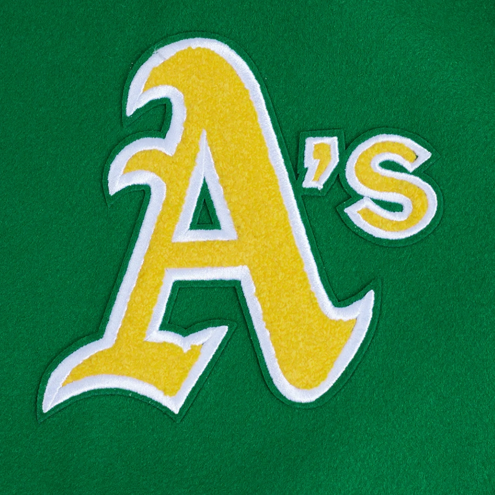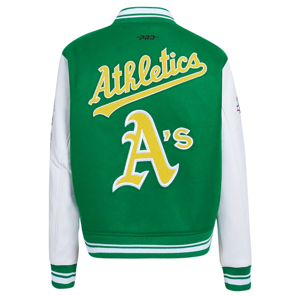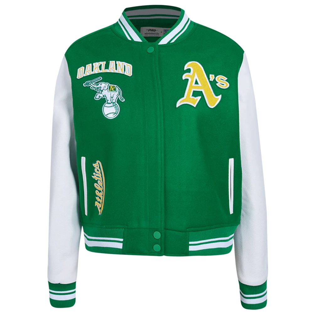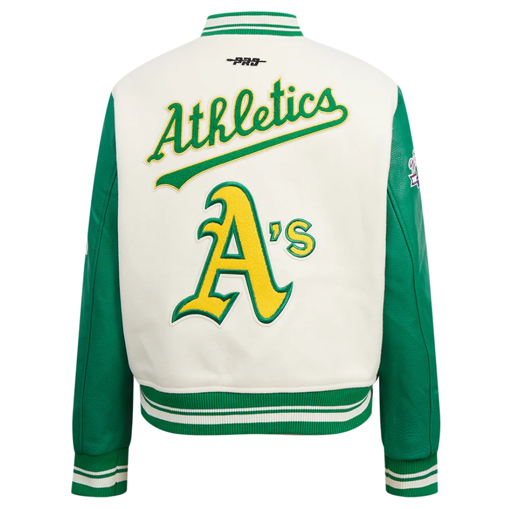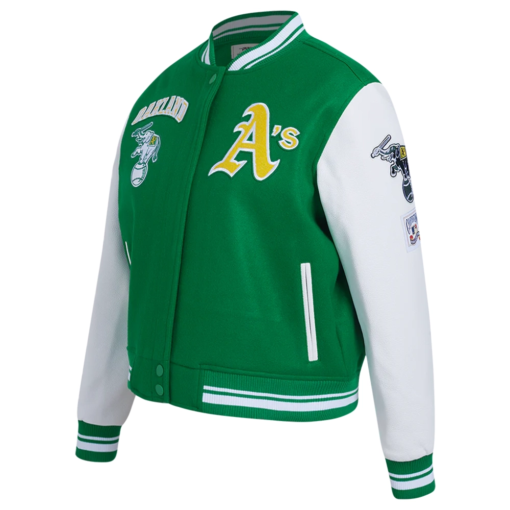 Experience the timeless style and proud heritage of the team with these exceptional Women’s Oakland Athletics Retro Classic Wool & Leather jackets. While the bold design remains consistent, you have the choice between two striking color combinations: a classic cream body with contrasting green sleeves or a vibrant green body with crisp white sleeves. Crafted with a premium wool exterior and leather sleeves for a signature look and feel, they feature a smooth viscose lining on the inside for comfort. The ribbed knitted collar, cuffs, and hemline lock in warmth, while the front offers both button & zipper closure. Proudly display your fandom with the iconic embroidered team name and logo appliqué details across the chest, back, and sleeve. Practicality is built-in with two slashed waist pockets and two inner pockets. This Women’s Oakland Athletics Retro Classic Varsity jacket is the ultimate way to showcase your A’s loyalty.