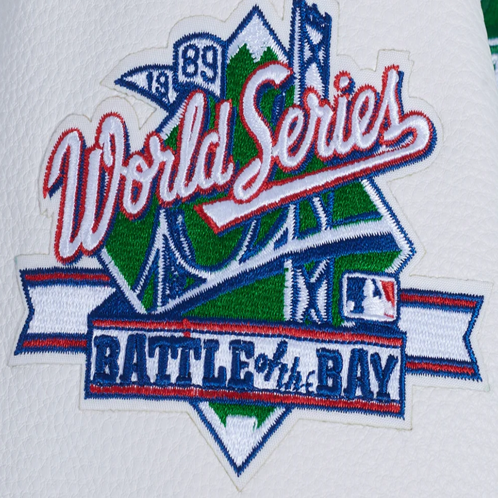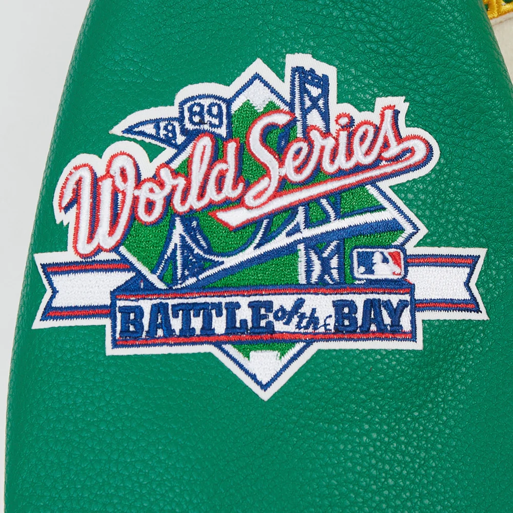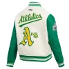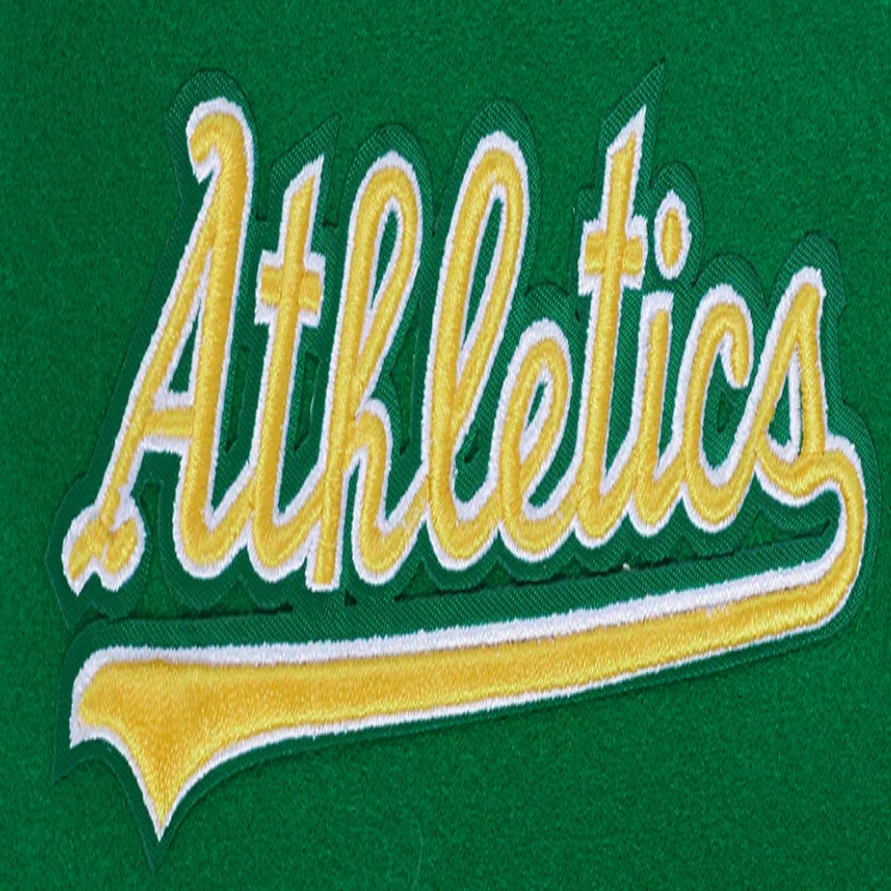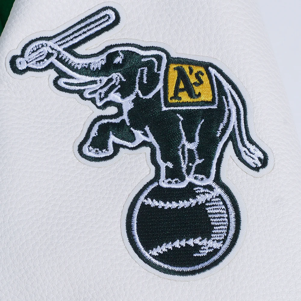 Experience the timeless style and proud heritage of the team with these exceptional Women’s Oakland Athletics Retro Classic Wool & Leather jackets. While the bold design remains consistent, you have the choice between two striking color combinations: a classic cream body with contrasting green sleeves or a vibrant green body with crisp white sleeves. Crafted with a premium wool exterior and leather sleeves for a signature look and feel, they feature a smooth viscose lining on the inside for comfort. The ribbed knitted collar, cuffs, and hemline lock in warmth, while the front offers both button & zipper closure. Proudly display your fandom with the iconic embroidered team name and logo appliqué details across the chest, back, and sleeve. Practicality is built-in with two slashed waist pockets and two inner pockets. This Women’s Oakland Athletics Retro Classic Varsity jacket is the ultimate way to showcase your A’s loyalty.